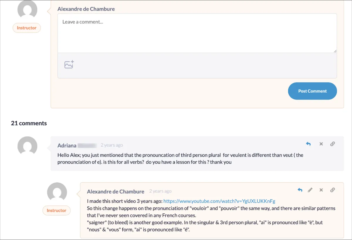 I will email you a list of lessons I recommend for intermediate & advanced learners. That being said, even intermediate and advanced learners learn quite a lot from my level 1 course. The lessons I created are like no other and will always teach you tons at every level: pronunciation, vocabulary and use of structures.